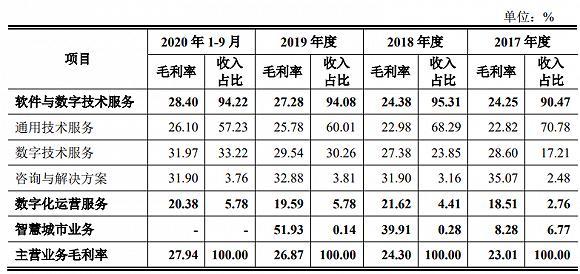 过去几年,数字技术服务和咨询解决方案的收入占比有所提升,从2017年合计占比19.69%增长到2020年前三季度合计占比36.98%。